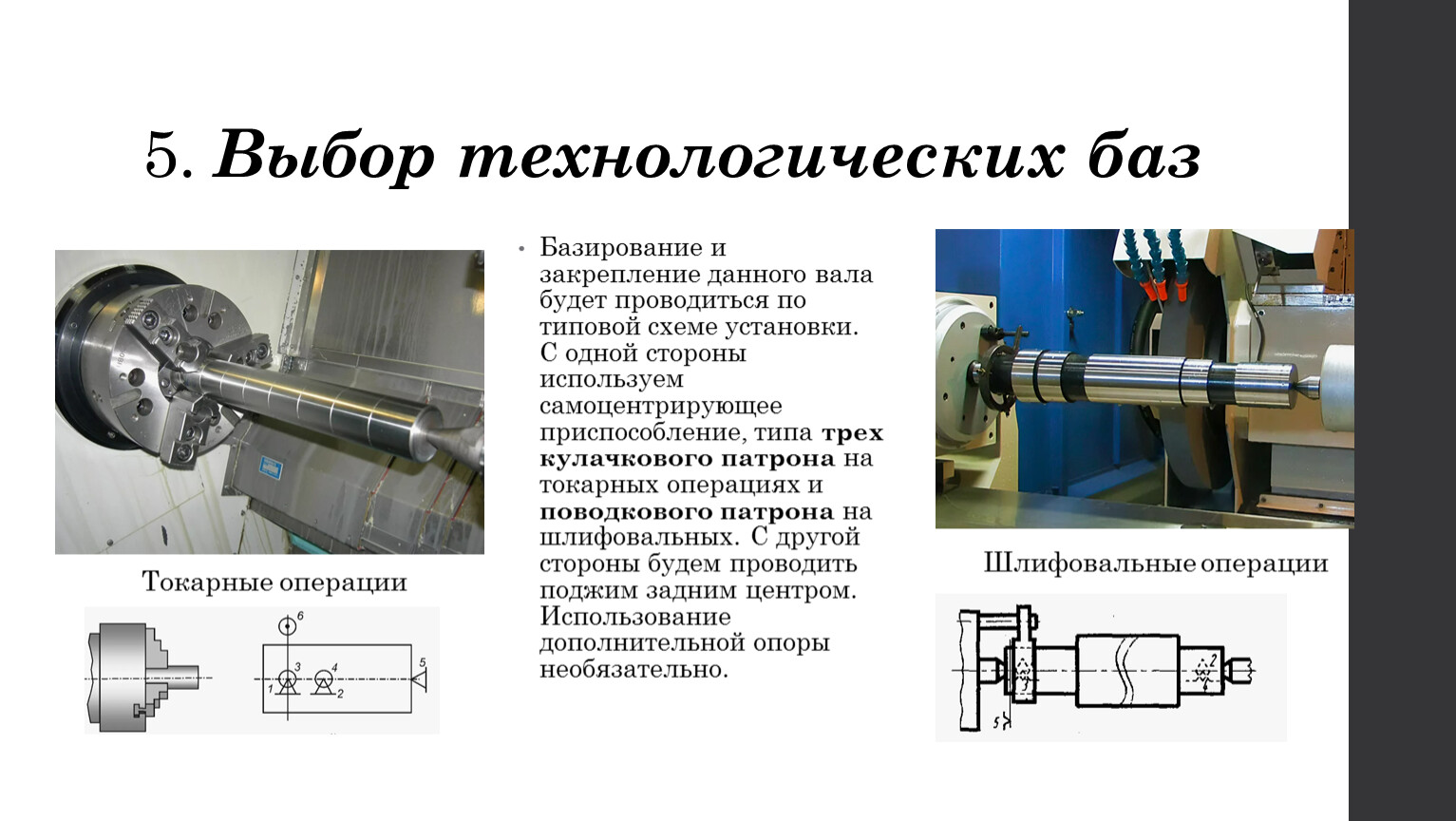 Базирование и закрепление данного вала будет проводиться по типовой схеме установки. С одной стороны используем самоцентрирующее приспособление, типа трех кулачкового патрона на токарных операциях и поводкового патрона на шлифовальных. С другой стороны будем проводить поджим задним центром. Использование дополнительной опоры необязательно.