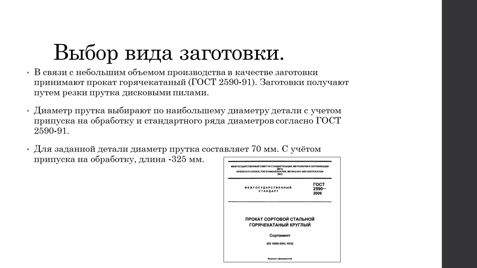 Для заданной детали диаметр прутка составляет 70 мм. С учётом припуска на обработку, длина -325 мм.