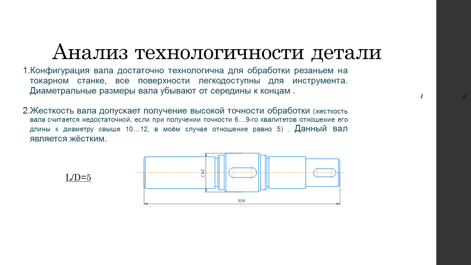Конфигурация вала достаточно технологична для обработки резаньем на токарном станке, все поверхности легкодоступны для инструмента. Диаметральные размеры вала убывают от середины к концам .