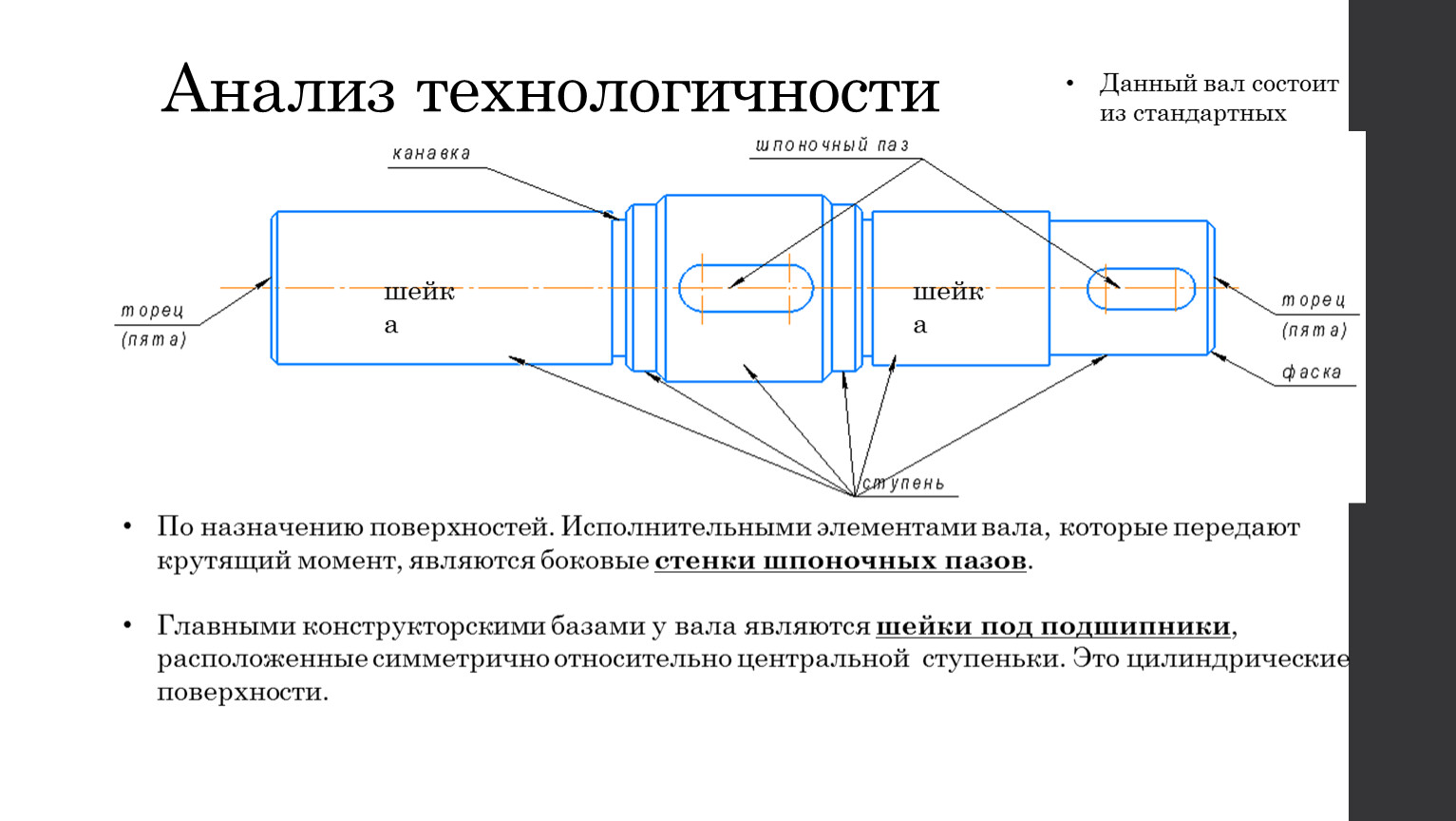 Главными конструкторскими базами у вала являются шейки под подшипники, расположенные симметрично относительно центральной ступеньки. Это цилиндрические поверхности.
