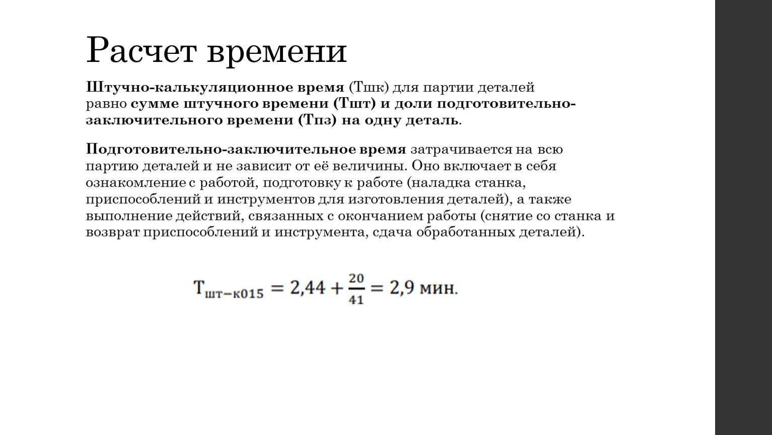 Штучно-калькуляционное время (Тшк) для партии деталей равно сумме штучного времени (Тшт) и доли подготовительно-заключительного времени (Тпз) на одну деталь.