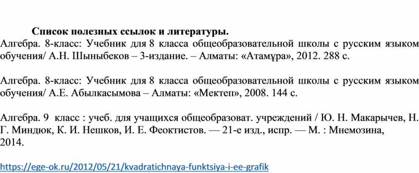 Алгебра. 8-класс: Учебник для 8 класса общеобразовательной школы с русским языком обучения/ А.Н. Шыныбеков – 3-издание. – Алматы: «Атамұра», 2012. 288 с.