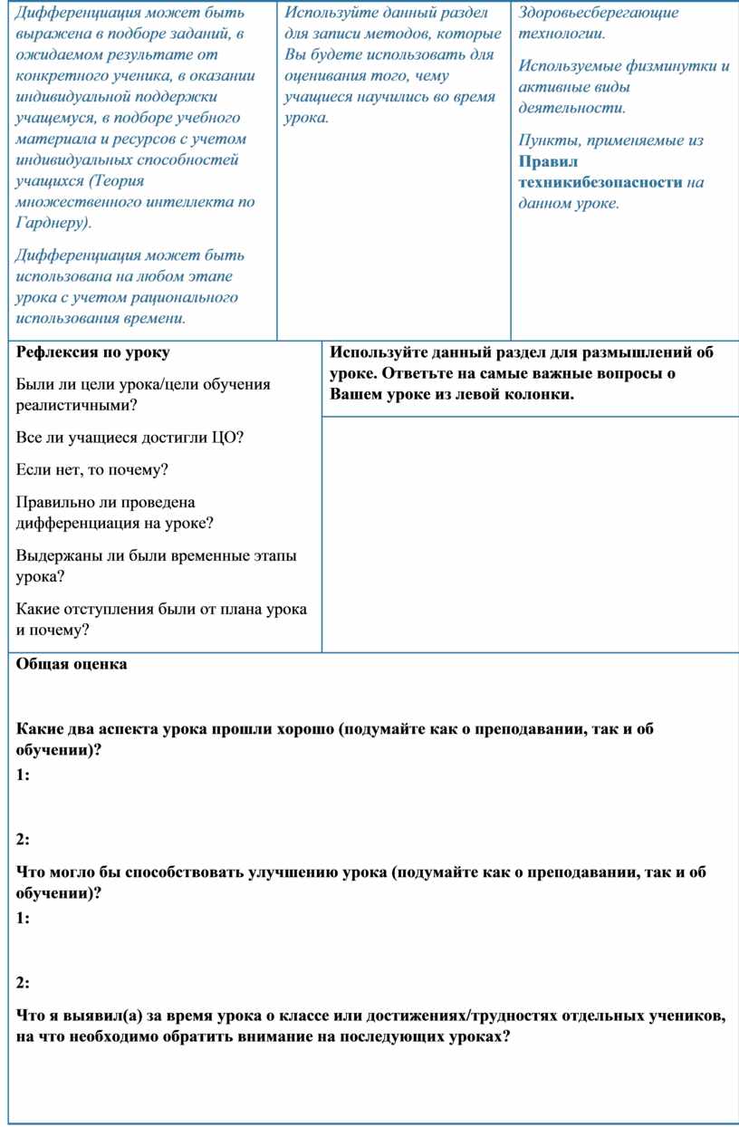 Используйте данный раздел для размышлений об уроке. Ответьте на самые важные вопросы о Вашем уроке из левой колонки. |