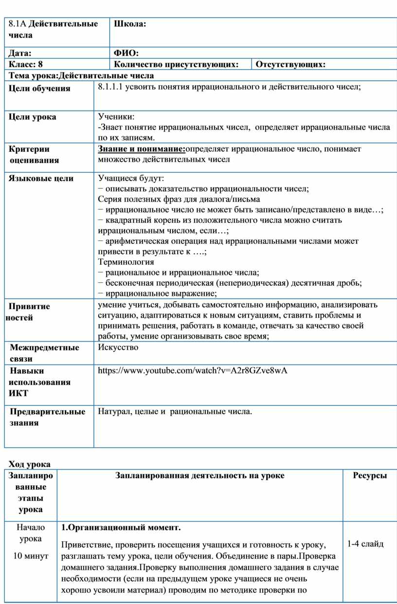 Учащиеся будут: − описывать доказательство иррациональности чисел; Серия полезных фраз для диалога/письма − иррациональное число не может быть записано/представлено в виде…; − квадратный корень из положительного числа можно считать иррациональным числом, если…; − арифметическая операция над иррациональными числами может привести в результате к ….; Терминология − рациональное и иррациональное числа; − бесконечная периодическая (непериодическая) десятичная дробь; − иррациональное выражение; |