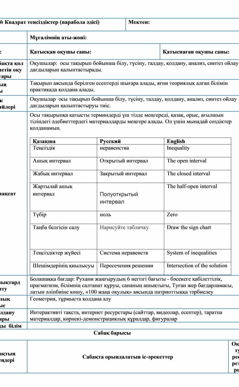 Сабақ № Квадрат теңсіздіктер (парабола әдісі) |