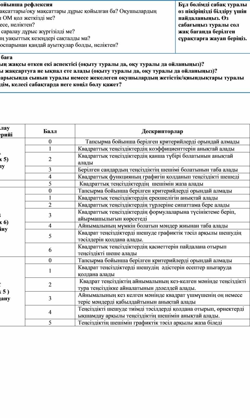 Сабақ бойынша рефлексия Сабақ мақсаттары/оқу мақсаттары дұрыс қойылған ба? Оқушылардың барлығы ОМ қол жеткізді ме? Жеткізбесе, неліктен? Сабақта саралау дұрыс жүргізілді ме? Сабақтың уақыттық кезеңдері сақталды ма? Сабақ жоспарынан қандай ауытқулар болды, неліктен? |