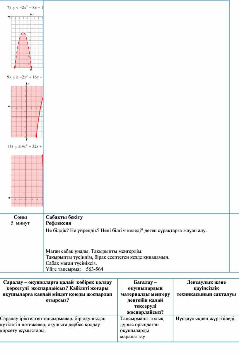 Маған сабақ ұнады. Тақырыпты меңгердім. Тақырыпты түсіндім, бірақ есептеген кезде қиналамын. Сабақ маған түсініксіз. Үйге тапсырма: 563-564 |