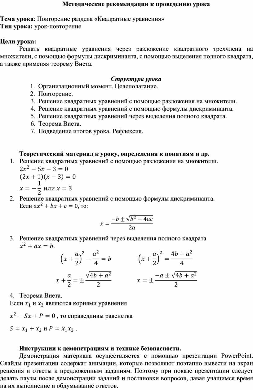 Тема урока: Повторение раздела «Квадратные уравнения»