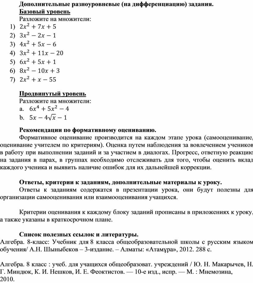 Алгебра. 8-класс: Учебник для 8 класса общеобразовательной школы с русским языком обучения/ А.Н. Шыныбеков – 3-издание. – Алматы: «Атамұра», 2012. 288 с.