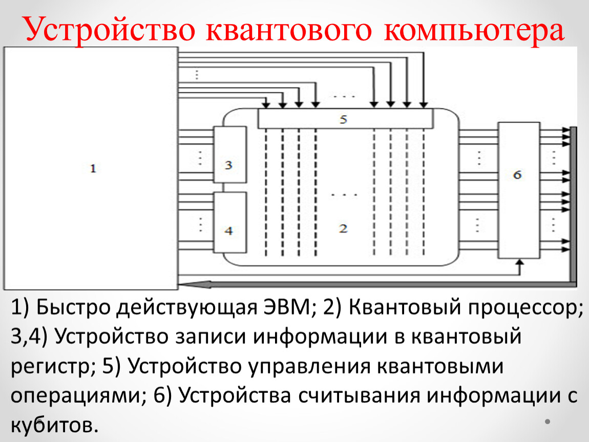 1) Быстро действующая ЭВМ; 2) Квантовый процессор; 3,4) Устройство записи информации в квантовый регистр; 5) Устройство управления квантовыми операциями; 6) Устройства считывания информации с кубитов.