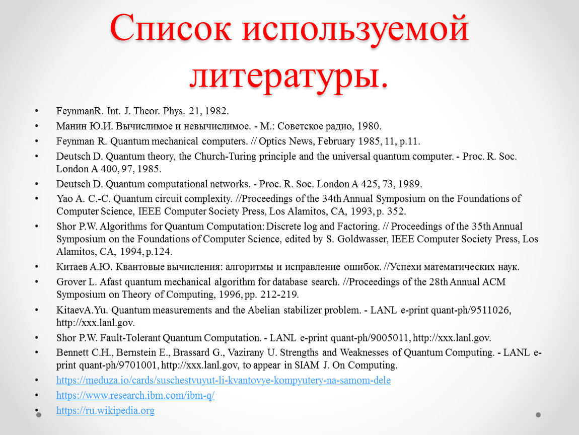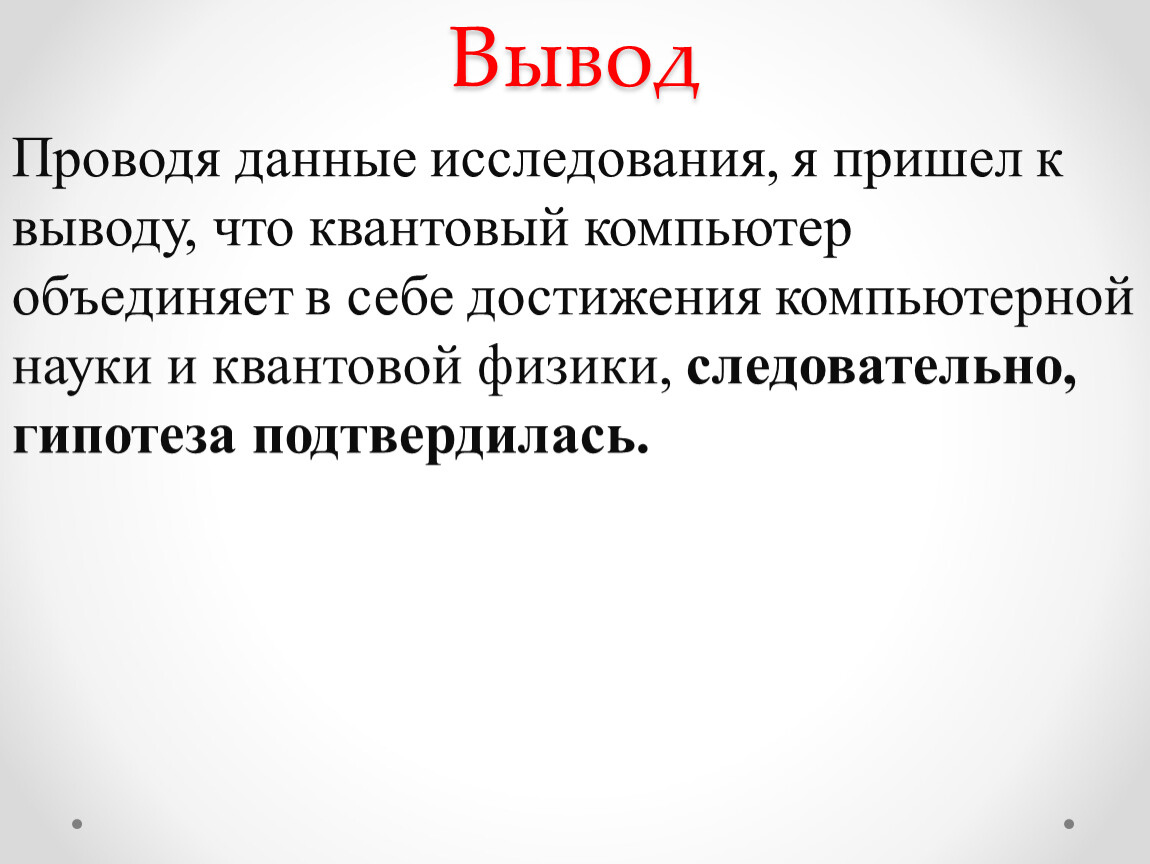 Проводя данные исследования, я пришел к выводу, что квантовый компьютер объединяет в себе достижения компьютерной науки и квантовой физики, следовательно, гипотеза подтвердилась.