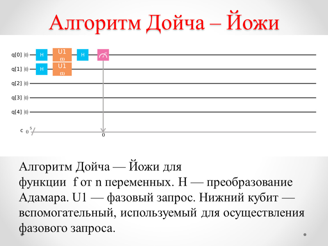 Алгоритм Дойча — Йожи для функции f от n переменных. H — преобразование Адамара. U1 — фазовый запрос. Нижний кубит — вспомогательный, используемый для осуществления фазового запроса.