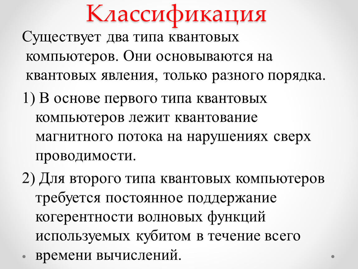 2) Для второго типа квантовых компьютеров требуется постоянное поддержание когерентности волновых функций используемых кубитом в течение всего времени вычислений.