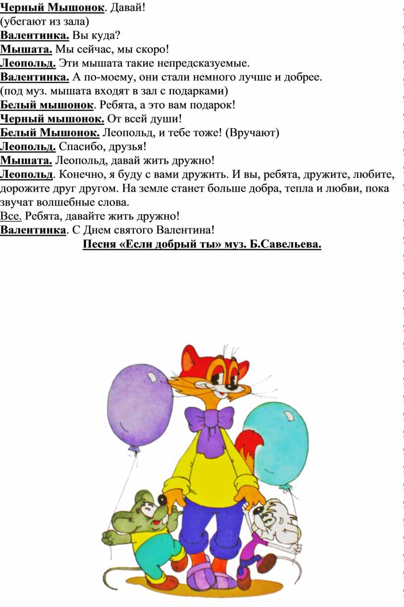 Действующие лица: Взрослые – Фея Валентинка, Кот Леопольд, Белый Мышонок, Черный Мышонок.