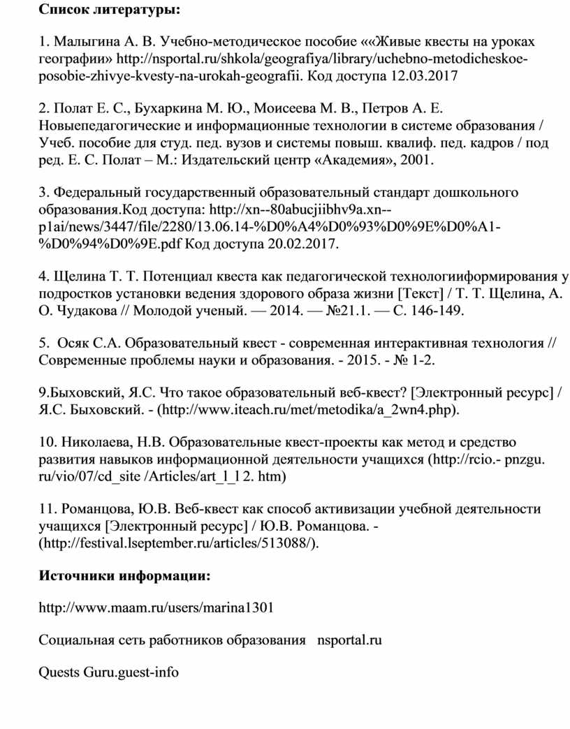 1. Малыгина А. В. Учебно-методическое пособие ««Живые квесты на уроках географии» http://nsportal.ru/shkola/geografiya/library/uchebno-metodicheskoe-posobie-zhivye-kvesty-na-urokah-geografii. Код доступа 12.03.2017