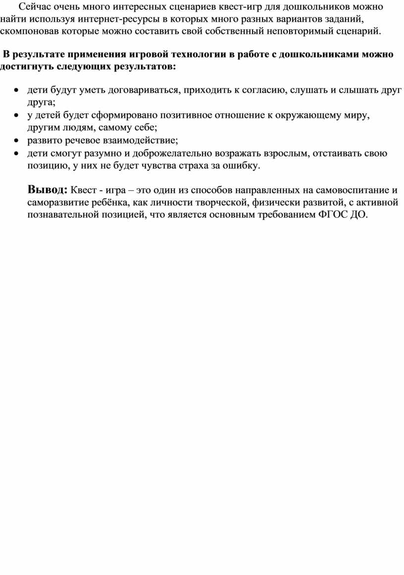 Вывод: Квест - игра – это один из способов направленных на самовоспитание и саморазвитие ребёнка, как личности творческой, физически развитой, с активной познавательной позицией, что является основным требованием ФГОС ДО.
