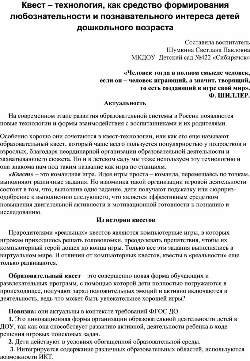 Квест – технология, как средство формирования любознательности и познавательного интереса детей дошкольного возраста