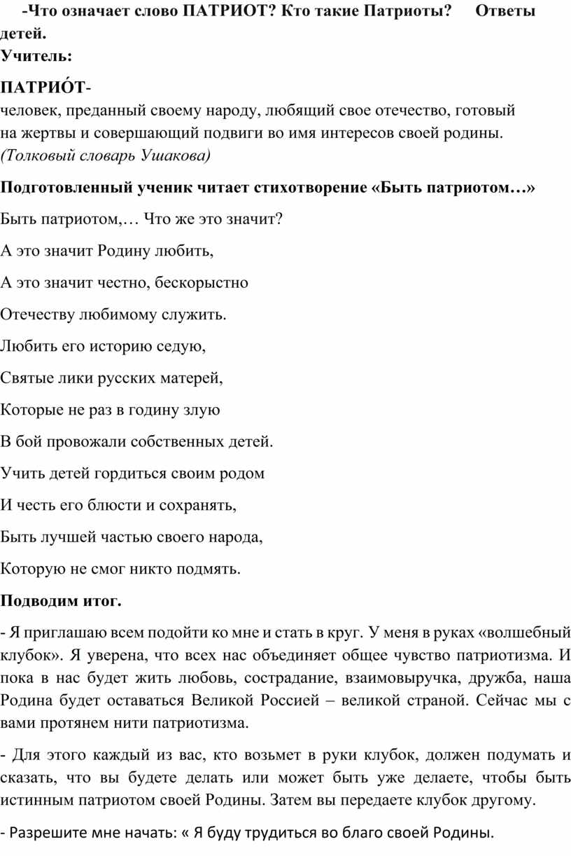 Подготовленный ученик читает стихотворение «Быть патриотом…»
