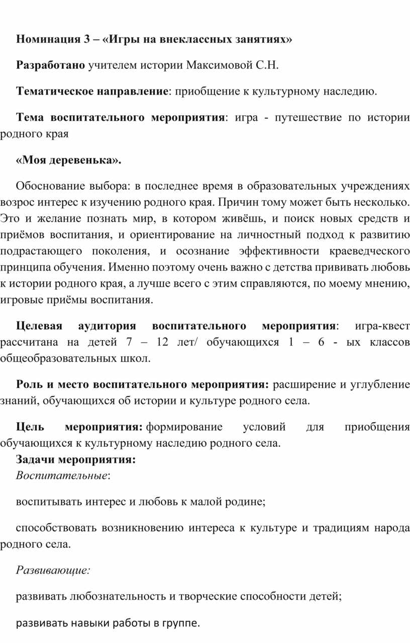 Обоснование выбора: в последнее время в образовательных учреждениях возрос интерес к изучению родного края. Причин тому может быть несколько. Это и желание познать мир, в котором живёшь, и поиск новых средств и приёмов воспитания, и ориентирование на личностный подход к развитию подрастающего поколения, и осознание эффективности краеведческого принципа обучения. Именно поэтому очень важно с детства прививать любовь к истории родного края, а лучше всего с этим справляются, по моему мнению, игровые приёмы воспитания.