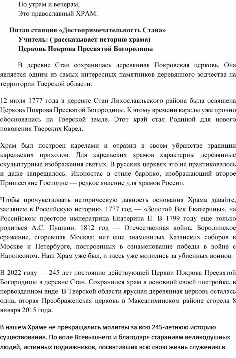 В 2022 году — 245 лет постоянно действующей Церкви Покрова Пресвятой Богородицы в деревне Стан. Сохранился храм в основной своей постройке, в первозданном виде. В Тверской области ярусная деревянная церковь осталась одна, вторая Преображенская церковь в Максатихинском районе сгорела 8 января 2015 года.