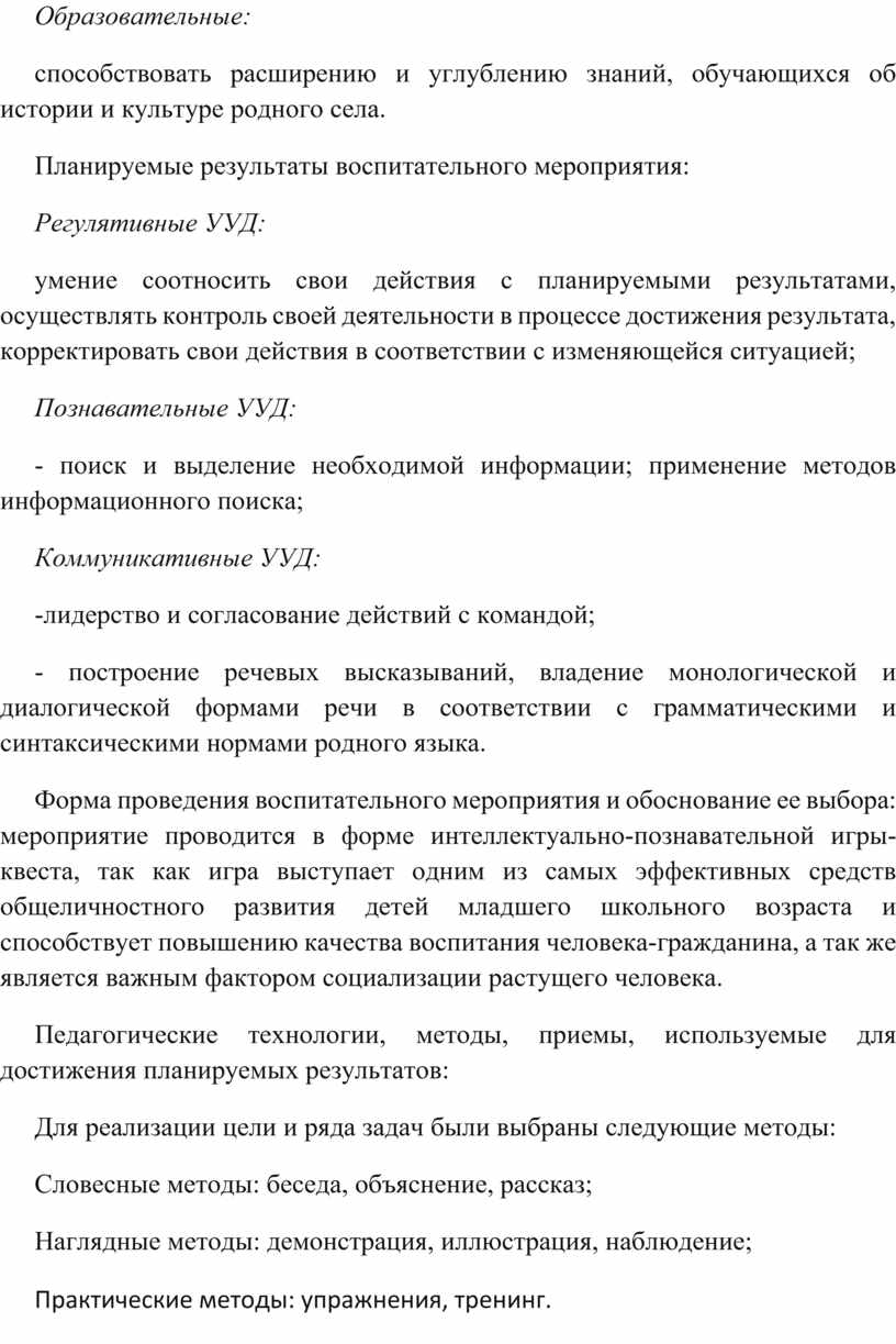 Роль и место воспитательного мероприятия: расширение и углубление знаний, обучающихся об истории и культуре родного села.