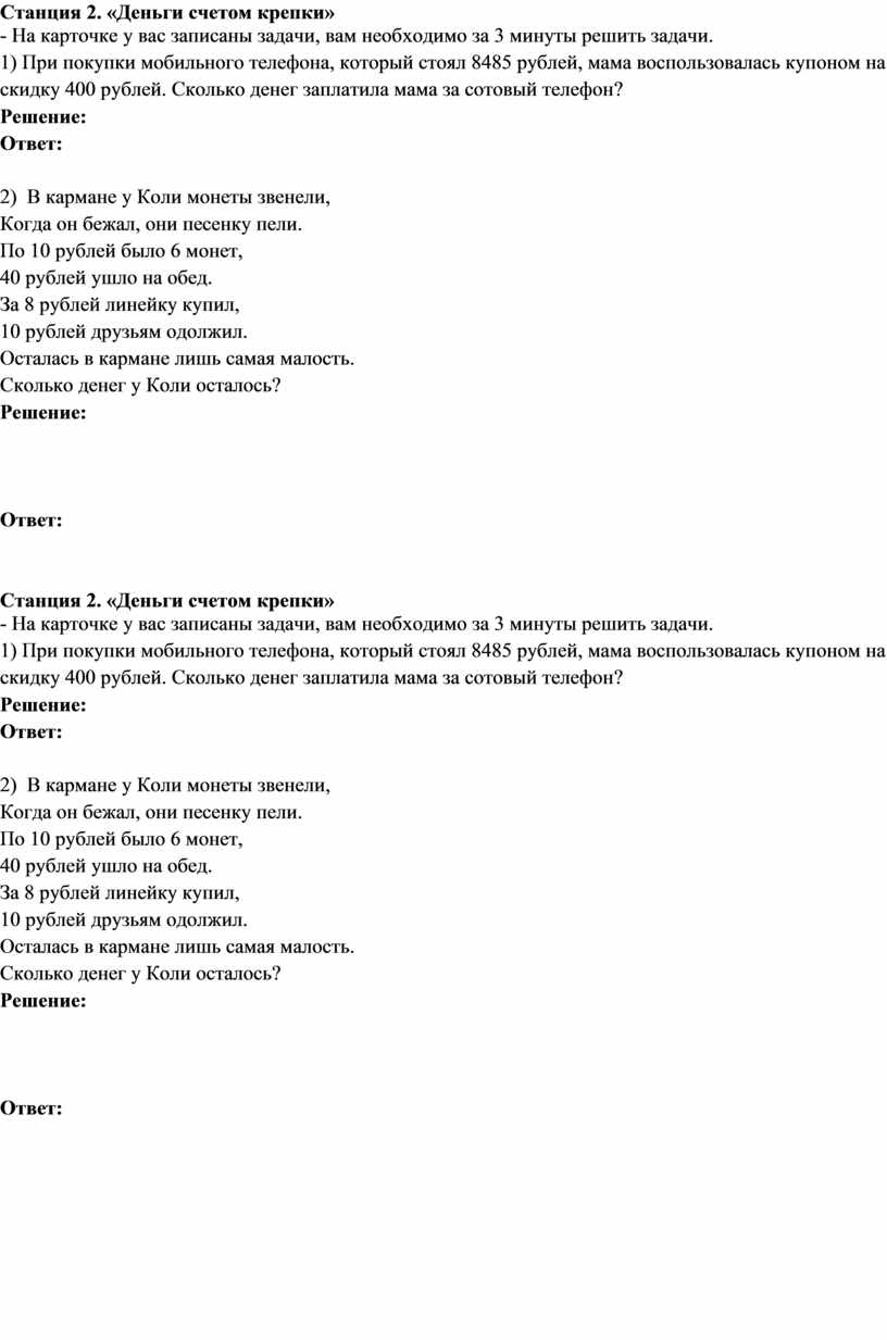 - На карточке у вас записаны задачи, вам необходимо за 3 минуты решить задачи.