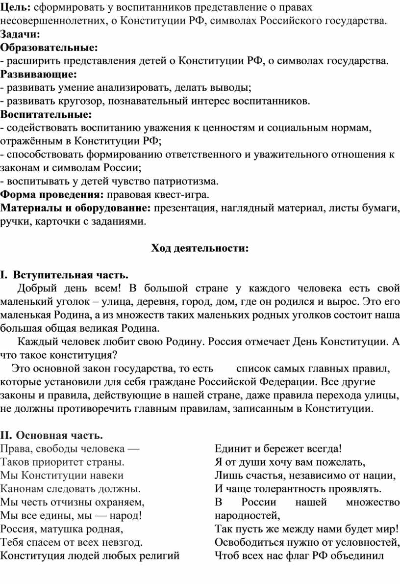 Цель: сформировать у воспитанников представление о правах несовершеннолетних, о Конституции РФ, символах Российского государства.