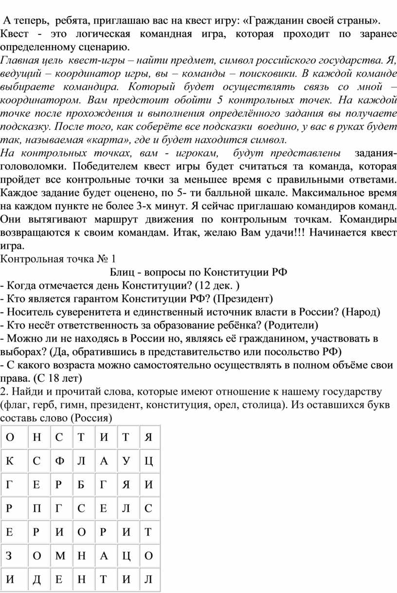 А теперь, ребята, приглашаю вас на квест игру: «Гражданин своей страны».