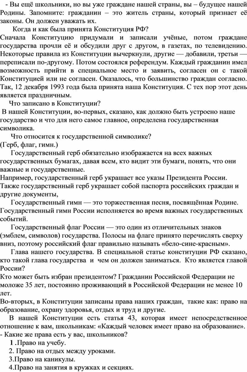 - Вы ещё школьники, но вы уже граждане нашей страны, вы – будущее нашей Родины. Запомните: гражданин – это житель страны, который признает её законы. Он должен уважать их.