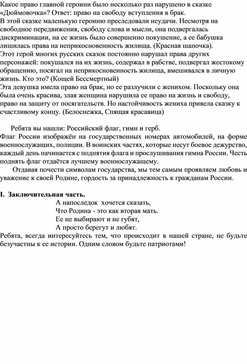 5. Какое право главной героини было несколько раз нарушено в сказке «Дюймовочка»? Ответ: право на свободу вступления в брак.