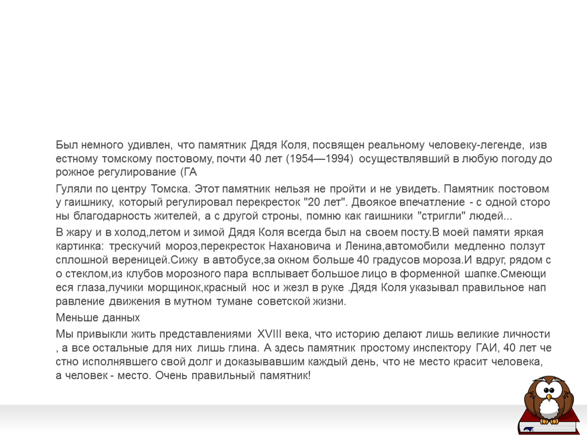 Был немного удивлен, что памятник Дядя Коля, посвящен реальному человеку-легенде, известному томскому постовому, почти 40 лет (1954—1994) осуществлявший в любую погоду дорожное регулирование (ГА