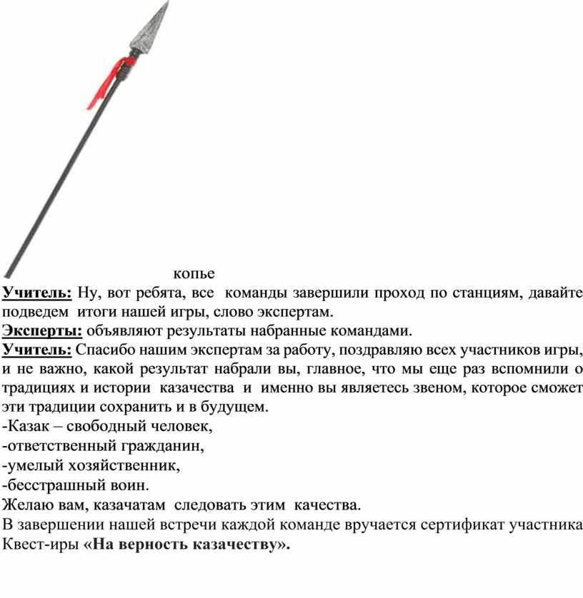 Учитель: Спасибо нашим экспертам за работу, поздравляю всех участников игры, и не важно, какой результат набрали вы, главное, что мы еще раз вспомнили о традициях и истории казачества и именно вы являетесь звеном, которое сможет эти традиции сохранить и в будущем.