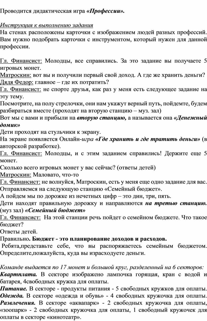 Предварительная работа: чтение художественной литературы: К. Чуковский «Муха-цокотуха»; В. Даль «Пословицы и поговорки», А. Кравченко «Больше знать, больше уметь». Просмотр мультфильмов про финансы: «Уроки Тетушки совы», «Простоквашино», «Смешарики», «Фиксики». Изготовление лепбука с картотекой игр на тему «Семейный бюджет». Работа с родителями: оформление плакатов-коллажей «Бюджет моей семьи»