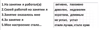 - Наше занятие к сожалению подходит к концу, и я предлагаю подвести итог занятия. - На слайде сейчас появится 6 незаконченных предложений и дано два варианта ответа, ваша задача выбрать одно предложение и закончить его с помощью одного из вариантов ответов. - Влад, скажи пожалуйста, что ты выбрал. - Хорошо, а ты что выбрала Саша? *спрашиваем еще несколько человек* - Спасибо за ваши ответы ребята. - Вы все были активны сегодня, все отлично потрудились. - До свиданья!