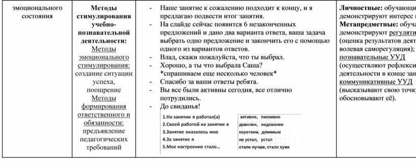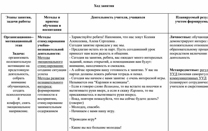 ● Метапредметные обучающиеся демонстрируют регулятивные УУД (целеполагание, планирование, прогнозирование, контроль, коррекция, оценка результатов деятельности, волевая саморегуляция); познавательные УУД (осуществляют синтез как составление целого из частей посредством работы с карточками, выбор наиболее эффективных способов решения задач при планировании деятельности, осуществляют рефлексию деятельности в конце занятия и на этапах); коммуникативные УУД (планируют сотрудничество с учителем и сверстниками, умеют адекватно и осознанно строить речевое высказывание в устной форме, высказывают свою точку зрения и обосновывают её)