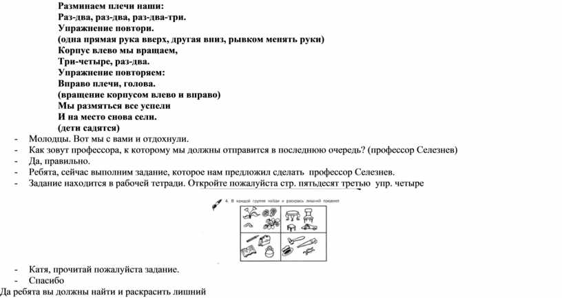 - Ребята покажите класс если у вас получились все 3 таблицы. - Что мы можем посоветовать ребятам у кого были ошибки? (ТРЕНИРОВАТЬ ПАМЯТЬ) - И из-за того , что мы успешно выполнили задание, нам профессор Почемучкин выдал колбу с волшебной водой и жидкое мыло. - Прежде, чем отправится дальше, предлагаю отдохнуть. - Встаньте пожалуйста из-за парт. Мы руками бодро машем, Разминаем плечи наши: Раз-два, раз-два, раз-два-три. Упражнение повтори. (одна прямая рука вверх, другая вниз, рывком менять руки) Корпус влево мы вращаем, Три-четыре, раз-два. Упражнение повторяем: Вправо плечи, голова. (вращение корпусом влево и вправо) Мы размяться все успели И на место снова сели. (дети садятся) - Молодцы. Вот мы с вами и отдохнули. - Как зовут профессора, к которому мы должны отправится в последнюю очередь? (профессор Селезнев) - Да, правильно. - Ребята, сейчас выполним задание, которое нам предложил сделать профессор Селезнев. - Задание находится в рабочей тетради. Откройте пожалуйста стр. пятьдесят третью упр. четыре