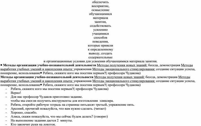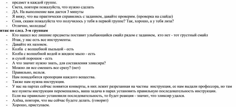 - Катя, прочитай пожалуйста задание. - Спасибо - Да ребята вы должны найти и раскрасить лишний предмет в каждой группе. - Света, повтори пожалуйста, что нужно сделать - ДА. На выполнение вам дается 3 минуты - Я вижу, что вы практически справились с заданием, давайте проверим. (проверка на слайде) - Соня, скажи пожалуйста что получилось у тебя в первой группе? Так, хорошо, а у тебя лиза? - Отлично, молодцы! итак по след. 3-м группам - Кто нашел все лишние предметы поставит улыбающийся смайл рядом с заданием, кто нет - тот грустный смайл - Итак, у нас есть все инструменты. - Давайте их назовем. - Колба с волшебной пыльцой - есть - Колба с волшебной водой и жидкое мыло - есть - и сухой порошок - есть - А что значит нужно знать, для составления эликсира? - Можно ли все смешать все сразу? (нет) - Правильно, нельзя. - Нам понадобятся пропорции каждого вещества. - Также нам нужна инструкция. - У вас на партах сейчас появятся конверты, в них лежит разрезанная на частиы инструкция, ее нам выдали профессора, но там все пункты инструкции перемешались, ваша задача в парах установить правильную последовательность инструкции. - Если вы правильно установили последовательность, то будет реакция - значит, что эликсир удался. - Алёна, повтори, что вы сейчас будете делать. (говорит) - Хорошо, приступаем.