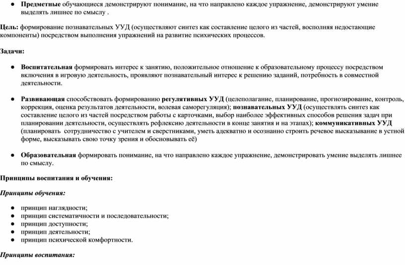 ● Образовательная формировать понимание, на что направлено каждое упражнение, демонстрировать умение выделять лишнее по смыслу.