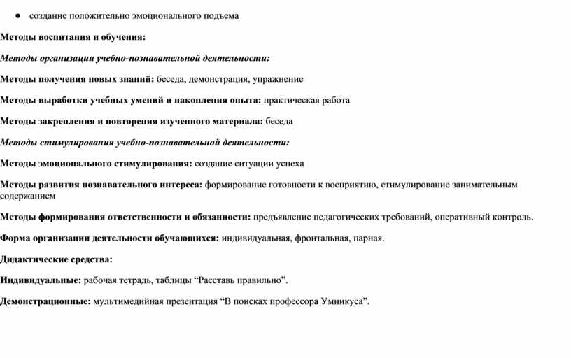 Методы организации учебно-познавательной деятельности Методы получения новых знаний: беседа, демонстрация Методы выработки учебных умений и накопления опыта: упражнения Методы эмоционального стимулирования: создание ситуации успеха, поощрение, использование |