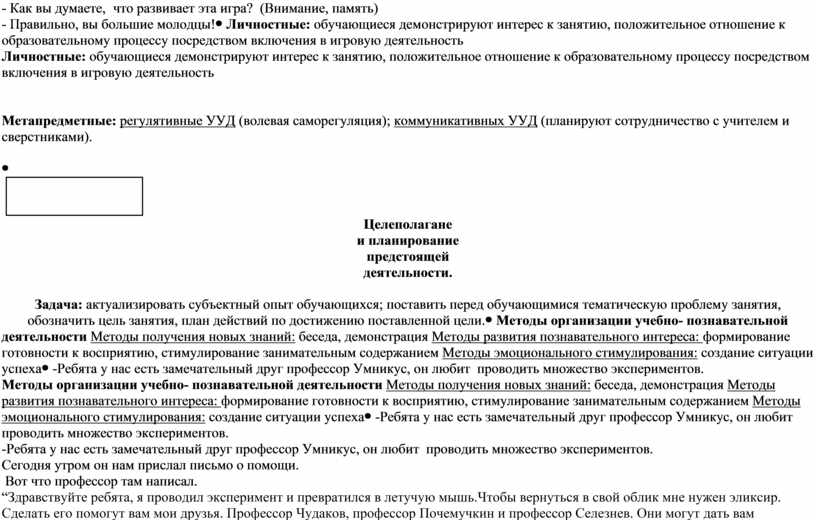 -Ребята у нас есть замечательный друг профессор Умникус, он любит проводить множество экспериментов. Сегодня утром он нам прислал письмо о помощи. Вот что профессор там написал. “Здравствуйте ребята, я проводил эксперимент и превратился в летучую мышь.Чтобы вернуться в свой облик мне нужен эликсир. Сделать его помогут вам мои друзья. Профессор Чудаков, профессор Почемучкин и профессор Селезнев. Они могут дать вам элементы для эликсира, но попросят вас выполнить задания. Я надеюсь на вас. ” -Вы готовы помочь профессору Умникусу? (Да) -Тогда давайте поможем профессору вернуть свой облик. - Ребята а как зовут друзей Умникуса? (ответы детей) - К кому мы отправимся первому? (профессор Чудаков) - Да ребята все правильно Посетить профессоров: