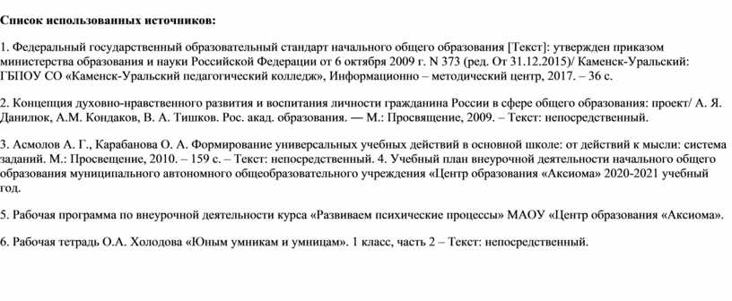 1. Федеральный государственный образовательный стандарт начального общего образования [Текст]: утвержден приказом министерства образования и науки Российской Федерации от 6 октября 2009 г. N 373 (ред. От 31.12.2015)/ Каменск-Уральский: ГБПОУ СО «Каменск-Уральский педагогический колледж», Информационно – методический центр, 2017. – 36 с.