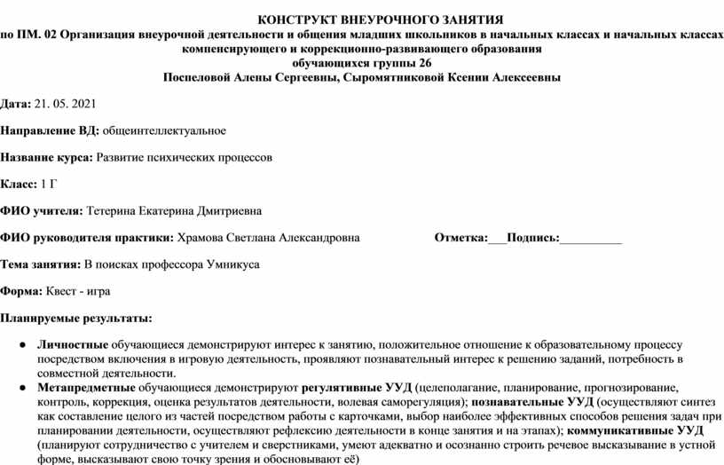 КОНСТРУКТ ВНЕУРОЧНОГО ЗАНЯТИЯ по ПМ. 02 Организация внеурочной деятельности и общения младших школьников в начальных классах и начальных классах компенсирующего и коррекционно-развивающего образования обучающихся группы 26 Поспеловой Алены Сергеевны, Сыромятниковой Ксении Алексеевны