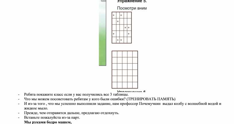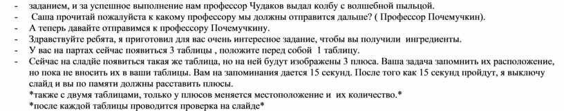 - Ребята, вы большие молодцы! Вы справились с заданием, и за успешное выполнение нам профессор Чудаков выдал колбу с волшебной пыльцой. - Саша прочитай пожалуйста к какому профессору мы должны отправится дальше? ( Профессор Почемучкин). - А теперь давайте отправимся к профессору Почемучкину. - Здравствуйте ребята, я приготовил для вас очень интересное задание, чтобы вы получили ингредиенты. - У вас на партах сейчас появиться 3 таблицы , положите перед собой 1 таблицу. - Сейчас на сладйе появиться такая же таблица, но на ней будут изображены 3 плюса. Ваша задача запомнить их расположение, но пока не вносить их в ваши таблицы. Вам на запоминания дается 15 секунд. После того как 15 секунд пройдут, я выключу слайд и вы по памяти должны расставить плюсы. *также с двумя таблицами, только у плюсов меняется местоположение и их количество.* *после каждой таблицы проводится проверка на слайде*