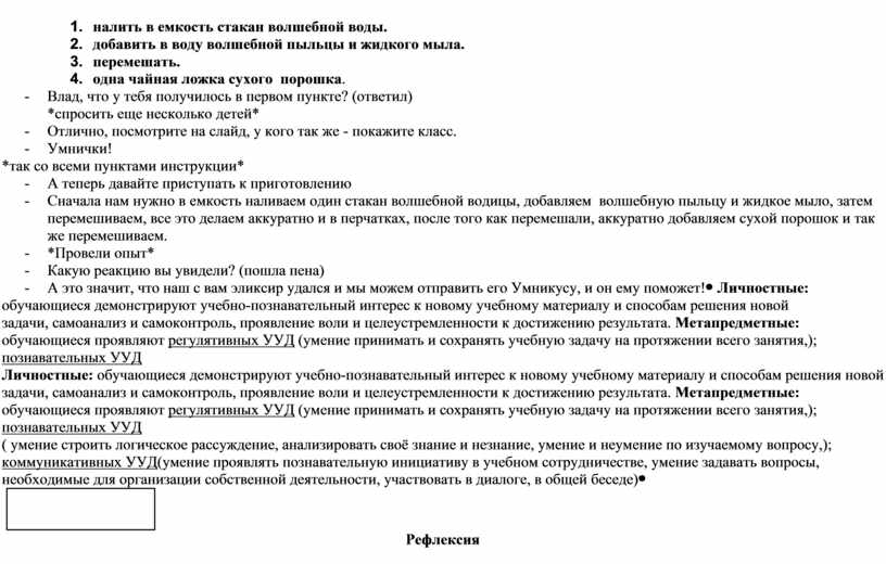 1. налить в емкость стакан волшебной воды. 2. добавить в воду волшебной пыльцы и жидкого мыла. 3. перемешать. 4. одна чайная ложка сухого порошка. - Влад, что у тебя получилось в первом пункте? (ответил) *спросить еще несколько детей* - Отлично, посмотрите на слайд, у кого так же - покажите класс. - Умнички! *так со всеми пунктами инструкции* - А теперь давайте приступать к приготовлению - Сначала нам нужно в емкость наливаем один стакан волшебной водицы, добавляем волшебную пыльцу и жидкое мыло, затем перемешиваем, все это делаем аккуратно и в перчатках, после того как перемешали, аккуратно добавляем сухой порошок и так же перемешиваем. - *Провели опыт* - Какую реакцию вы увидели? (пошла пена) - А это значит, что наш с вам эликсир удался и мы можем отправить его Умникусу, и он ему поможет! |