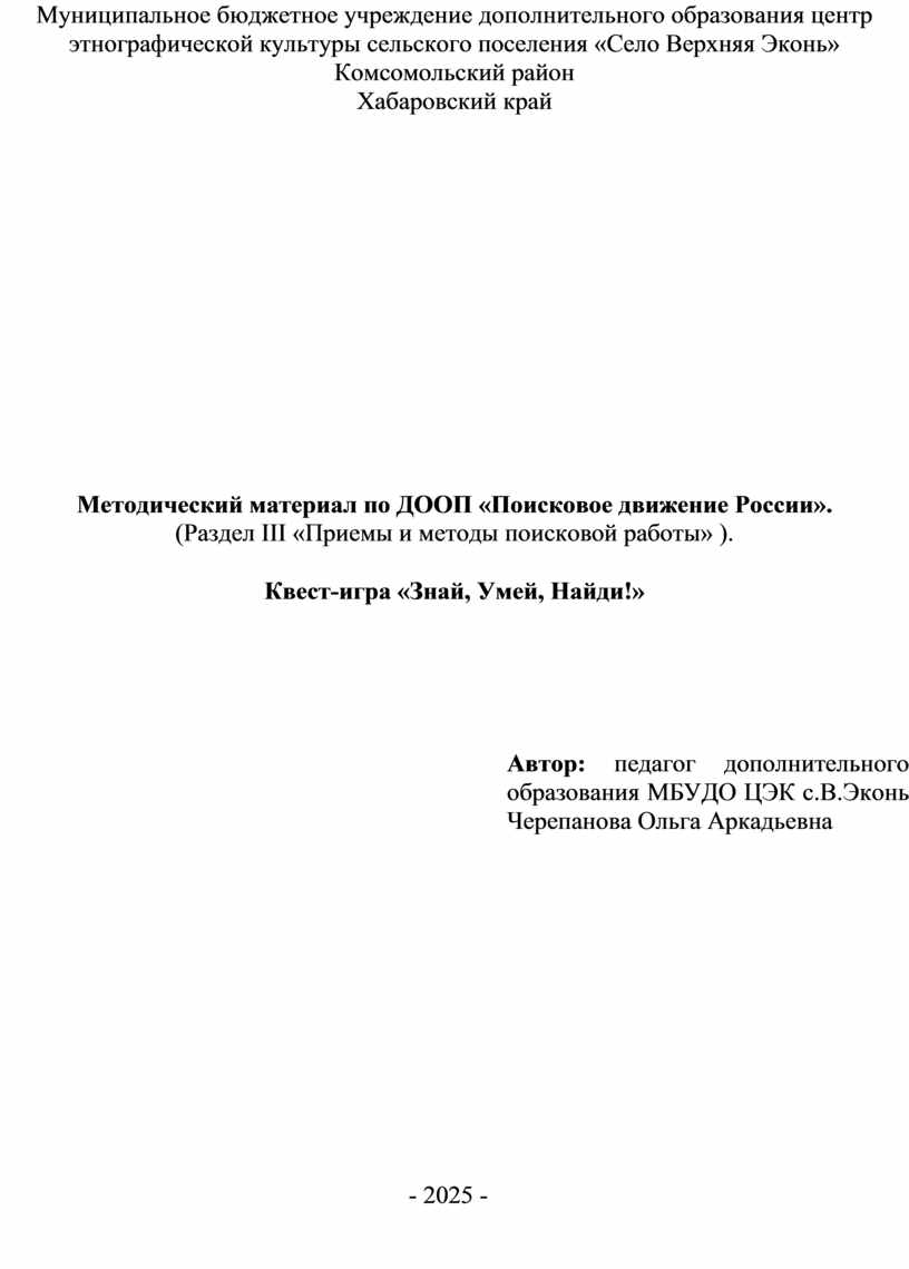 Автор: педагог дополнительного образования МБУДО ЦЭК с.В.Эконь Черепанова Ольга Аркадьевна