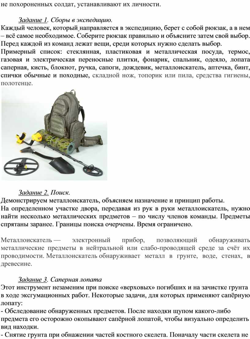 Примерный список: стеклянная, пластиковая и металлическая посуда, термос, газовая и электрическая переносные плитки, фонарик, спальник, одеяло, лопата саперная, кисть, блокнот, ручка, сапоги, дождевик, металлоискатель, аптечка, бинт, спички обычные и походные, складной нож, топорик или пила, средства гигиены, полотенце.