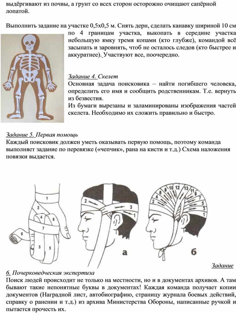 Каждый поисковик должен уметь оказывать первую помощь, поэтому команда выполняет задание по перевязке («чепчик», рана на кисти и т.д.) Схема наложения повязки выдается.