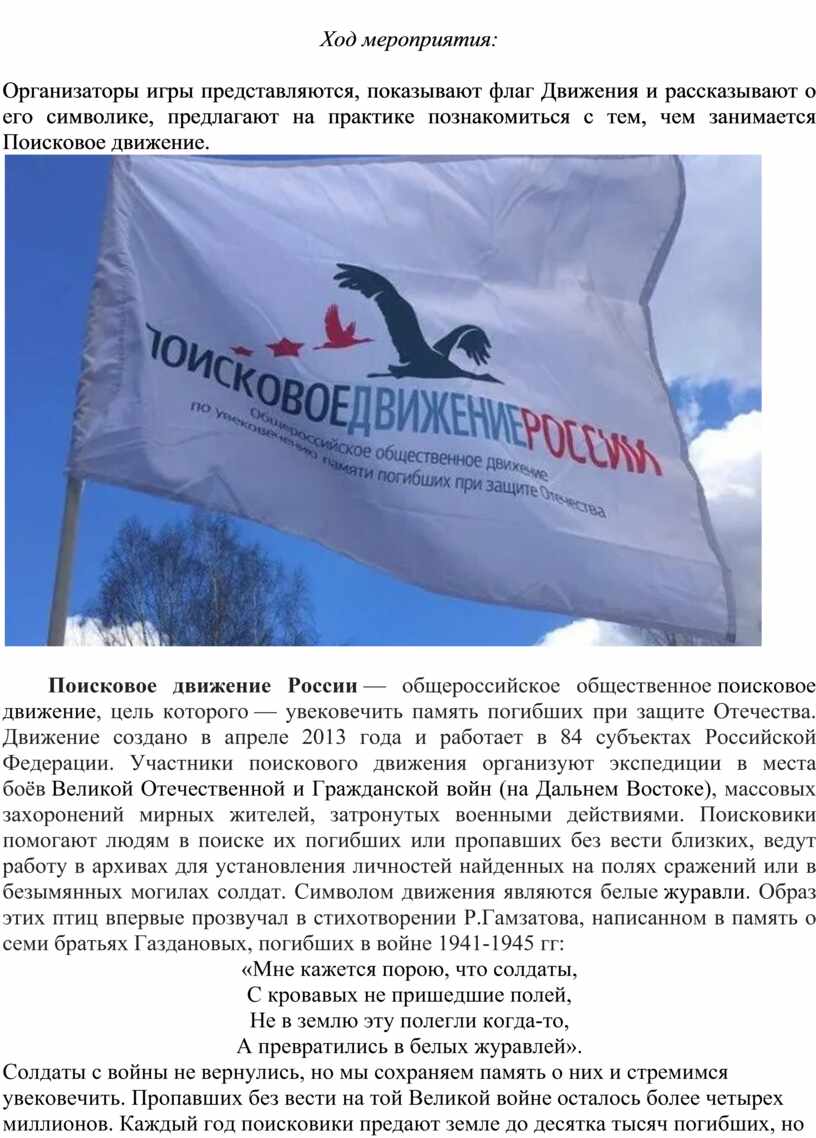 Организаторы игры представляются, показывают флаг Движения и рассказывают о его символике, предлагают на практике познакомиться с тем, чем занимается Поисковое движение.