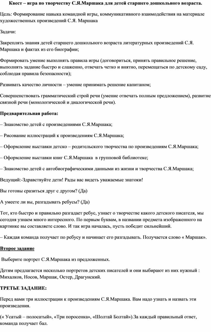 Квест – игра по творчеству С.Я.Маршака для детей старшего дошкольного возраста.