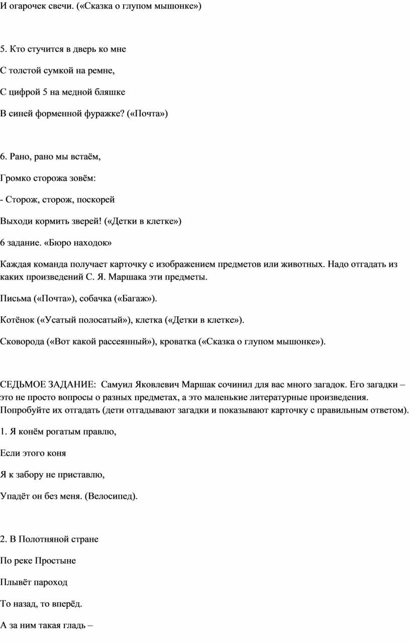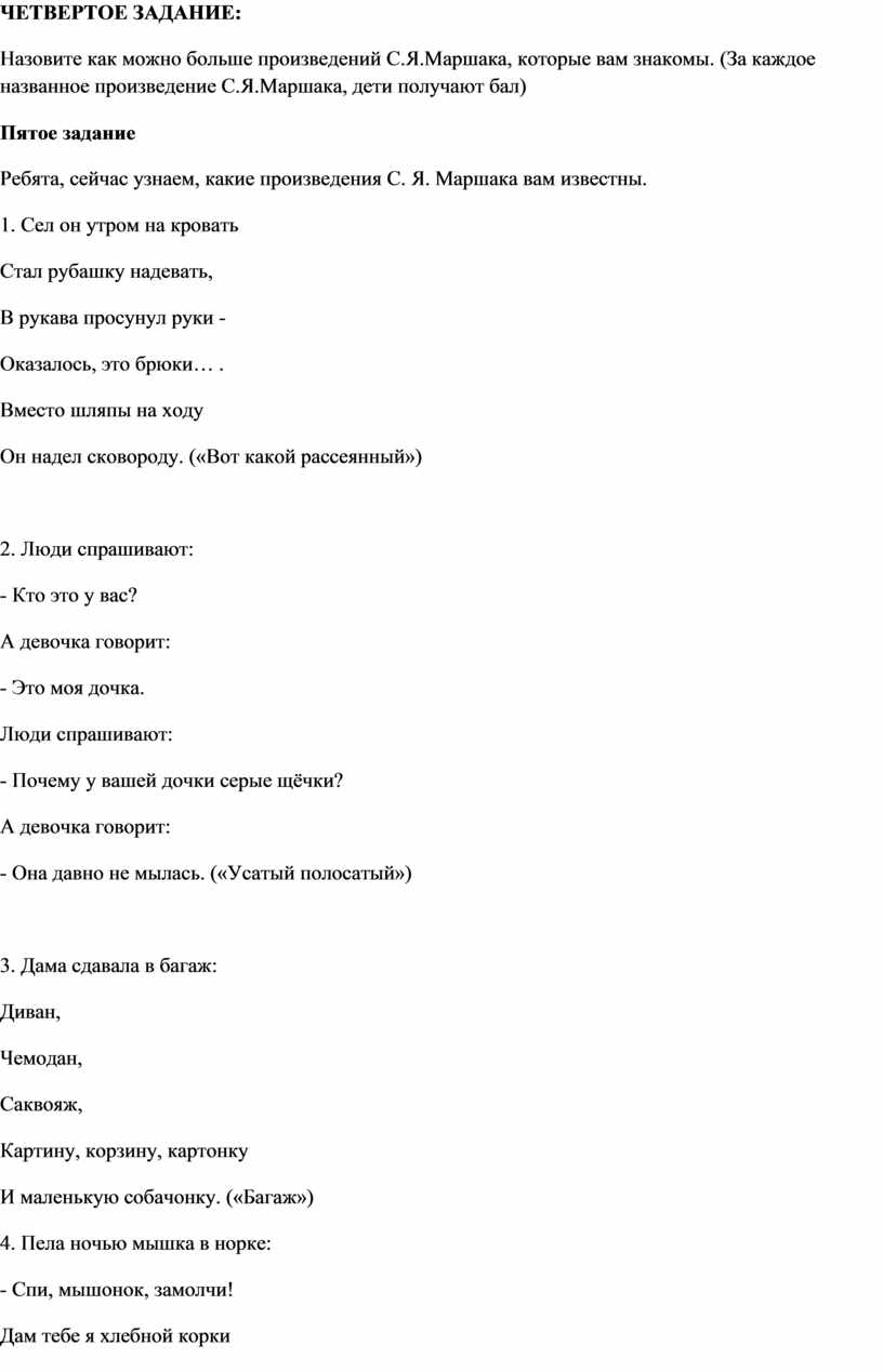 Каждая команда получает карточку с изображением предметов или животных. Надо отгадать из каких произведений С. Я. Маршака эти предметы.